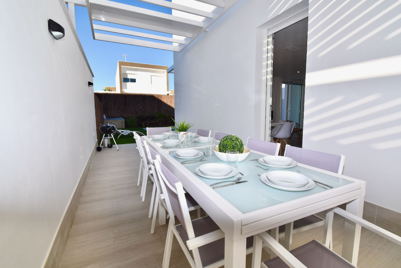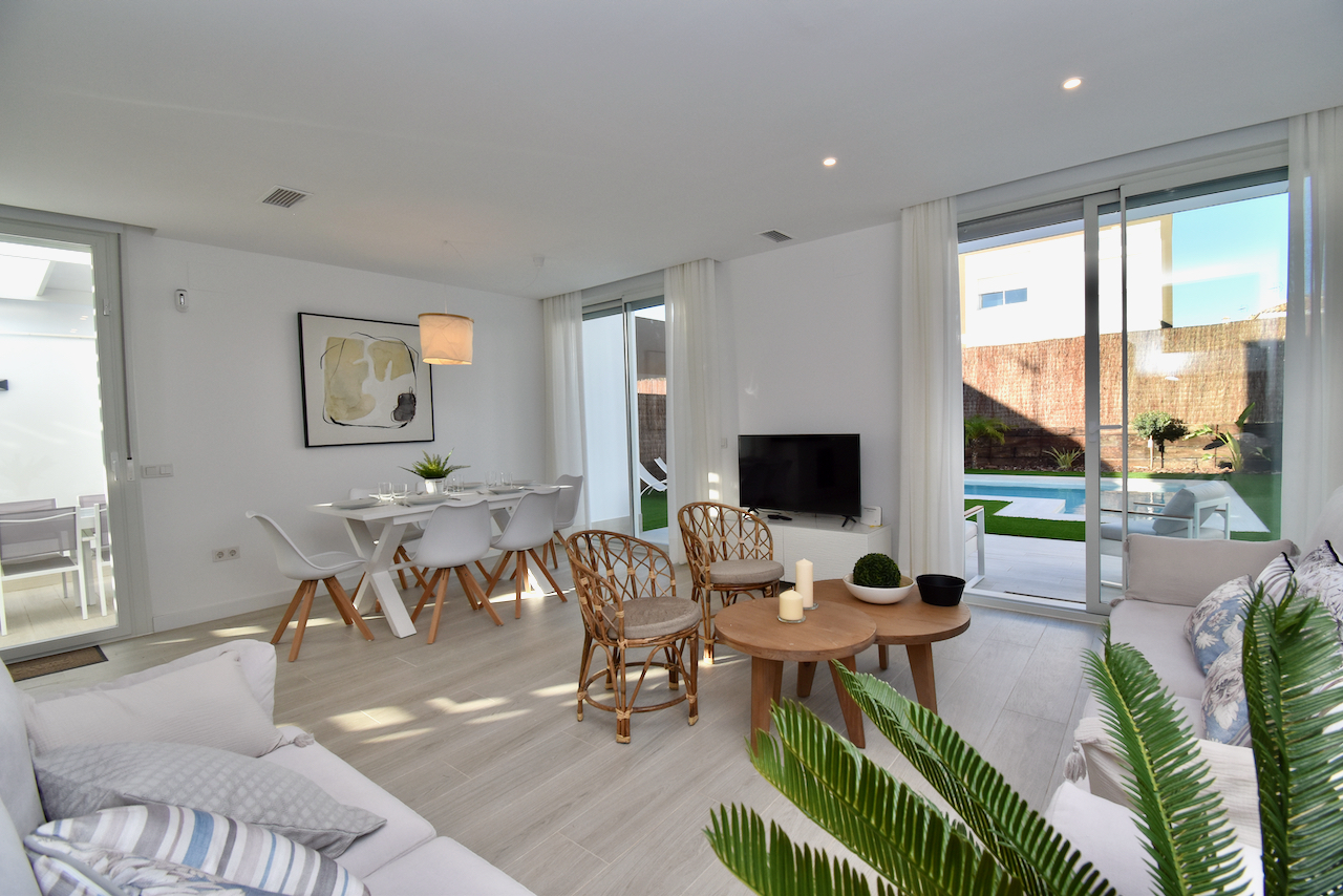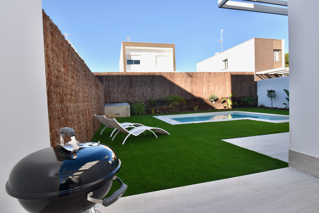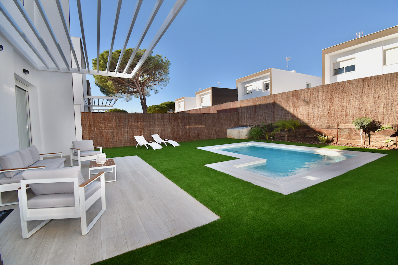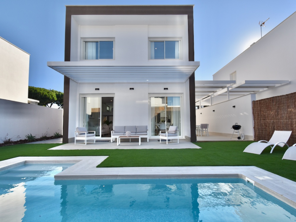Villa moderna y de lujo en Chiclana de la Frontera, Costa de la Luz, España con piscina privada para 10 personas. La casa está situada en una zona de playa y residencial y a 3 km de la playa de La Barrosa.